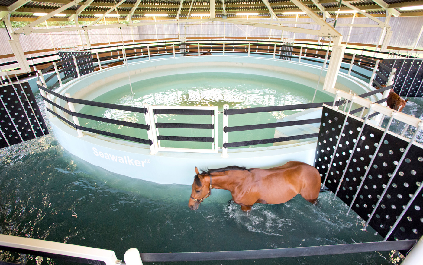 Seawalker horse walker with salinated, chilled, variable depth water. Controlled exercise, added water resistance, step up rehab and training.